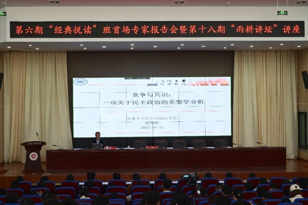 安徽大学社会与政治学院教授、博士生导师、副院长、新时代人民政协理论和实践研究基地(安徽省政协办公厅与安徽大学共建)主任徐理响作题为《竞争与共识:一项关于民主政治的类型学分析》的报告,既是校第六期“经典悦读”班的首场专家报告会,也是校第十八期“雨耕讲坛”的专题讲座。徐理响从民主政治类型中的“西方中心主义”、对西方民主实践的观察、对我国民主政治建设的理解等三个方面详细阐述,引导学生坚定马克思主义信仰、中国特色社会主义信念、中华民族伟大复兴信心,筑牢国家认同思想防线。