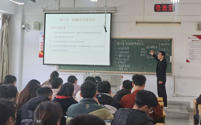 本次课程思政示范课由生物制药专业副教授钱森和老师讲授,课程内容为《药理学》第六章《胆碱受体激动药》。钱老师根据胆碱受体的分类,分别讲解了M受体和N受体激动药的代表性药物——乙酰胆碱、毛果芸香碱和烟碱,在讲解神经递质乙酰胆碱的发现时,融入了张锡钧院士的潜心科研,矢志报国的爱国情怀;在讲到毛果芸香碱缩瞳降低眼内压时,融入了“世界青光眼日”活动,倡议学生要做到守护眼部健康,才能共筑“睛”彩世界;将思政教育元素巧妙的融入到专业知识讲解过程中,做到了“润物无声”的教学育人目的。钱老师备课充分,讲课条理清晰,课中能够与学生积极互动,课堂气氛活跃,教学效果。