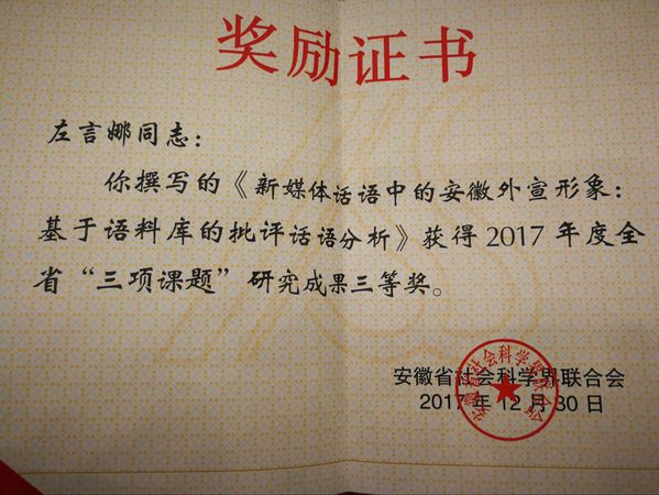 近日,安徽省社会科学界联合会发布2017年“三项课题”研究活动的成果奖通知,我校外国语学院教师路华撰写的《全球化语境下“中国文化走出去”战略与徽文化对外传播研究》获得研究成果二等奖,左言娜撰写的《新媒体话语中的安徽外宣形象:基于语料库的批评话语分析》获得三等奖。
