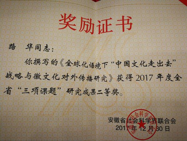 近日,安徽省社会科学界联合会发布2017年“三项课题”研究活动的成果奖通知,我校外国语学院教师路华撰写的《全球化语境下“中国文化走出去”战略与徽文化对外传播研究》获得研究成果二等奖,左言娜撰写的《新媒体话语中的安徽外宣形象:基于语料库的批评话语分析》获得三等奖。