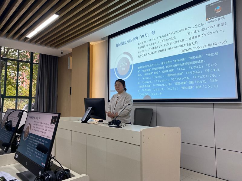 曹银阁基于博士论文,介绍了自己的研究基础、近期的研究进展。她首先提出语料库调查结果,日语「のだ」句在篇章中有接近20%的用法与接续词共现。由此分别从有标接续关系和无标接续关系「のだ」句的说明意义和逻辑意义,然后进一步介绍了「のだ」句的时态意义。汉日对比的部分,分别介绍了语篇逻辑关系下、时态意义下「のだ」句与对应的汉语句形式特征。最后在研究基础上做了展望,针对研究结论在日语教学,特别是作文指导中的应用,提出了一些问题和研究方向,汇报了今后的研究规划。现场部分教师和研究生参与了讨论和交流,学术氛围浓厚。
