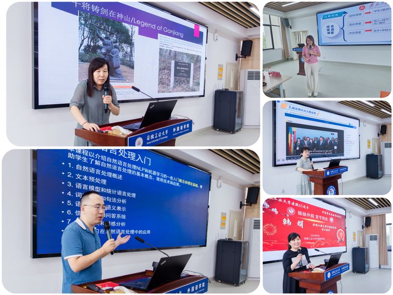 在经验分享中,我校外国语学院主持工作副院长唐雪梅表示安工业和安工程外院是“姊妹外院”,在学科专业、人才培养等方面有着许多共同点,在未来的发展中有着广阔的彼此借鉴和交流学习的前景。教学副院长李新国分享了我校外院英语专业参加并通过长三角“新文科”认证的历程和经验,详细介绍了英语专业“英语+人工智能”的人才培养特色和方案,以及大学外语口语教学改革的创新做法。MTI负责人张凤梅分享了“讲好芜湖故事,培养双语人才”徽文化案例库的构建;大外二部主任徐鹏分享了针对语言专业学生的“Python编程和R语言”交叉课程的建设;英语系主任韩利敏分享了如何通过参加教学竞赛不断全面提升自我的成长历程;大学英语课程负责人涂文婷分享了该省级一类课程的建设过程和特色亮点;博士教师韩娟分享了与姊妹外院合作编写的“英语+人工智能”系列教材的感受和心得。