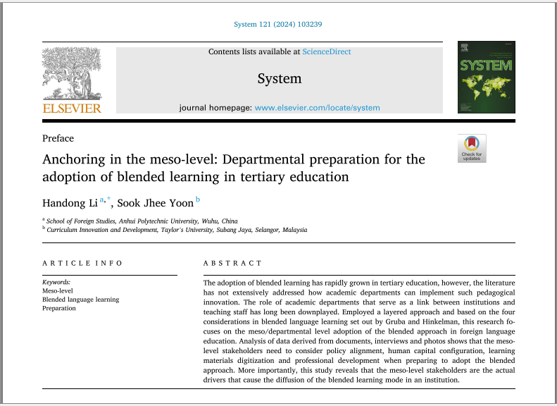 近日,我校外国语学院教师李寒冬博士以第一作者和通讯作者身份在国际语言学领域Top期刊System(最新影响因子为6.0,中国科学院人文科学领域SSCI一区期刊)上发表了题为“Anchoring in the meso-level: Departmental preparation for the adoption of blended learning in tertiary education” 的刊首论文。
