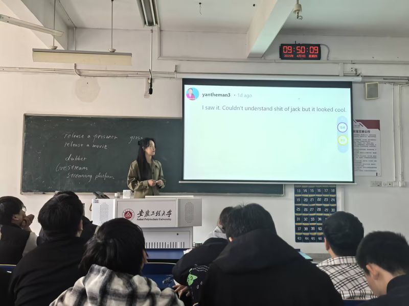 许文清讲授内容为《大学英语(4)》第五单元,围绕Never Judge by Appearances主题,通过知识、能力、价值三维度课程目标展开。她以时下网络热点话题哪吒2国外媒体引发的相关评论导入,通过对人物外在形象与内在品质的对比引发思考同时融入了语言知识的讲解和分析,如对相关词汇表达的回顾、提问与、词源探究,对文本的赏析等,最后学生在讨论与反思中让课程主题得到升华,起到了价值传递的课程思政育人效果。教学设计层层递进,帮助学生学习了相关词汇表达,锻炼了其阅读能力与思辨能力,实现了如何正确辨析善与恶的价值观引领。教学过程注重与学生互动,课堂氛围与学生反馈良好。