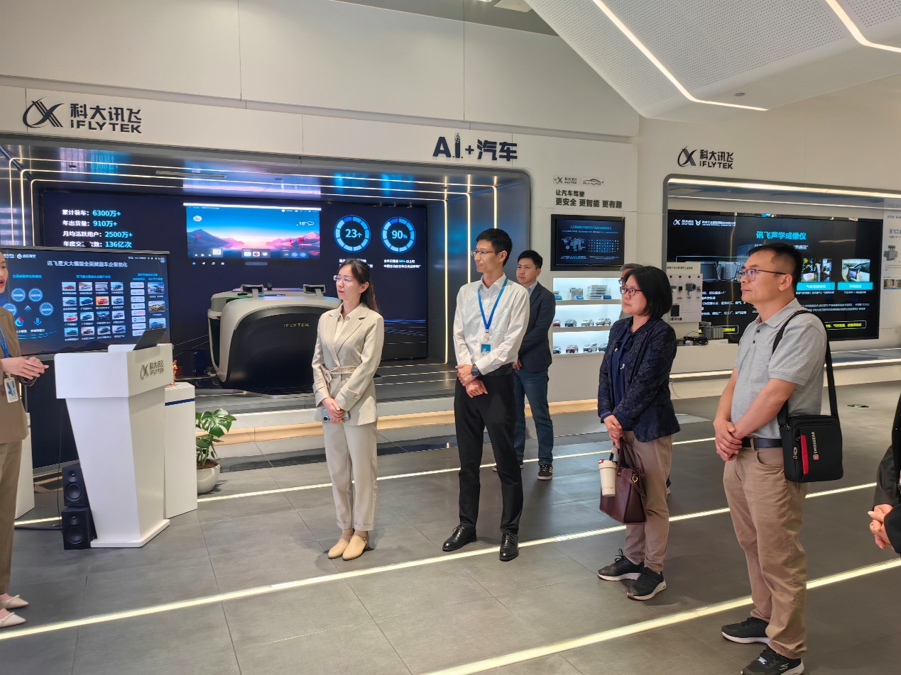 在科大讯飞股份有限公司,高教事业部总监杨振华、人事部总监成程、客服部总监沐燕等公司代表陪同参观了科大讯飞展厅,并进行了会谈,杨振华对李校林一行人表示欢迎,简要介绍科大讯飞的发展历程、人工智能相关产品和生态等。沐燕就通用人工智能助力高校数字化转型和高质量发展进行了汇报。李校林、李新国分别介绍了外国语学院毕业生情况、人才培养模式、校企合作等,随后,双方就人工智能赋能外语教育、校企合作、人才培养方案论证等方面展开深入讨论。