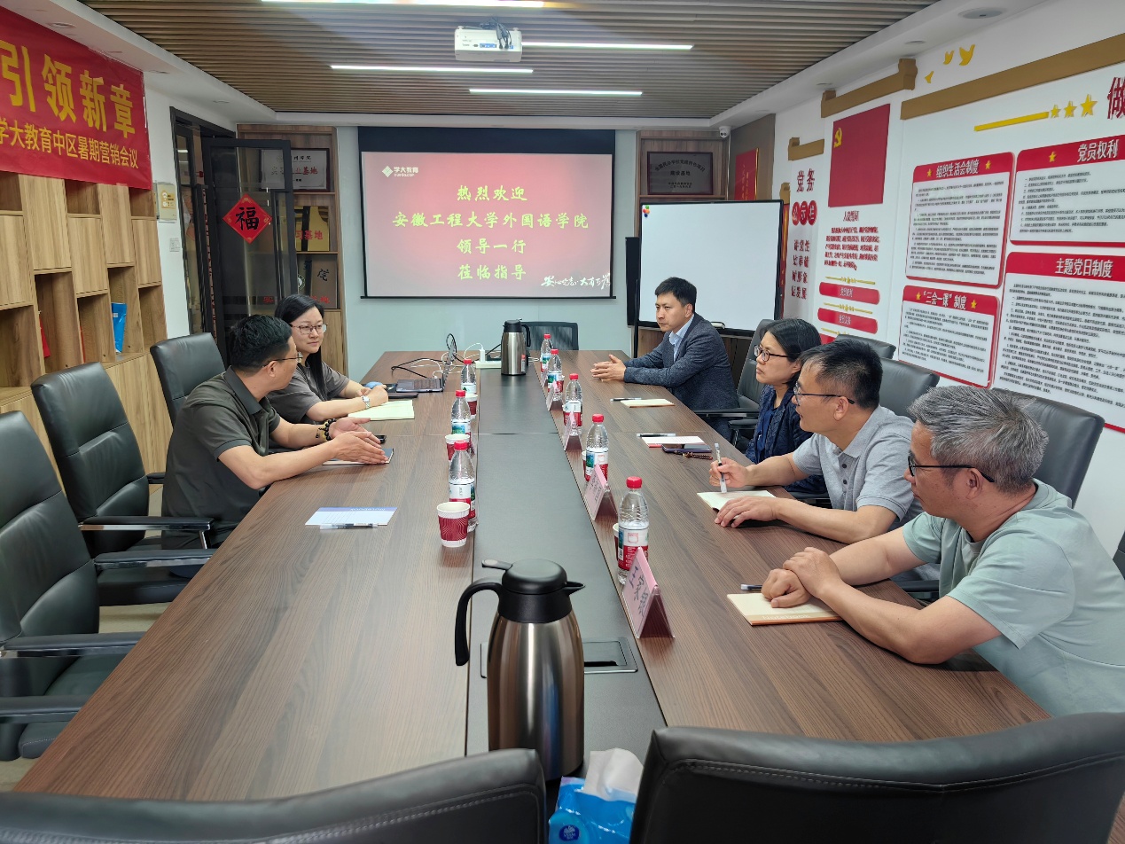 在合肥学大教育,公司总经理兼校长沈洁介绍了学大教育创业到上市的发展历程,以及目前的师资及社招和校招的基本情况,企业对外语类毕业生的要求。双方围绕教育行业发展趋势、教培机构用人要求等问题展开交流。